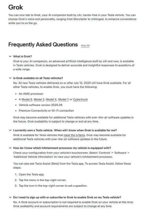 具體來說,Grok被推送給符合條件的特斯拉車輛,目前支持搭載AMD信息娛樂處理器且運行2025.26及以上版本車載軟件的車型,包括Model S、Model 3、Model X、Model Y和Cybertruck。