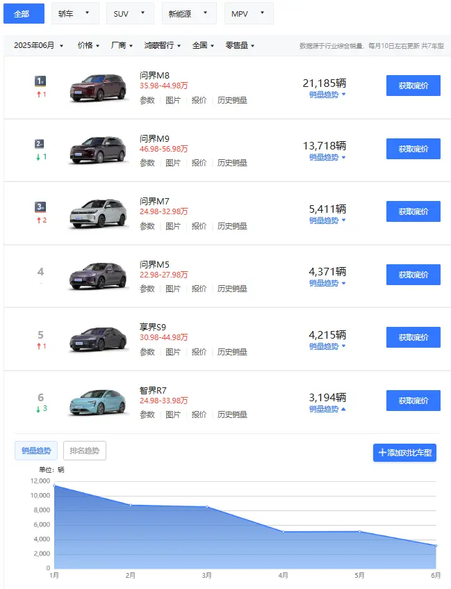 但當初上市33天大定破3萬的智界R7就有點不甚理想了,6月只賣出了2459 輛,6個月持續(xù)下滑,再跌就要糊了。