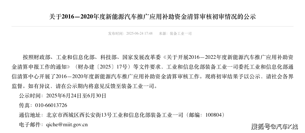 近期,工信部發布《關于2016—2020年度新能源汽車推廣應用補助資金清算審核初審情況的公示》,對2016~2020年新能源汽車補貼申請進行核查,并公布情況。