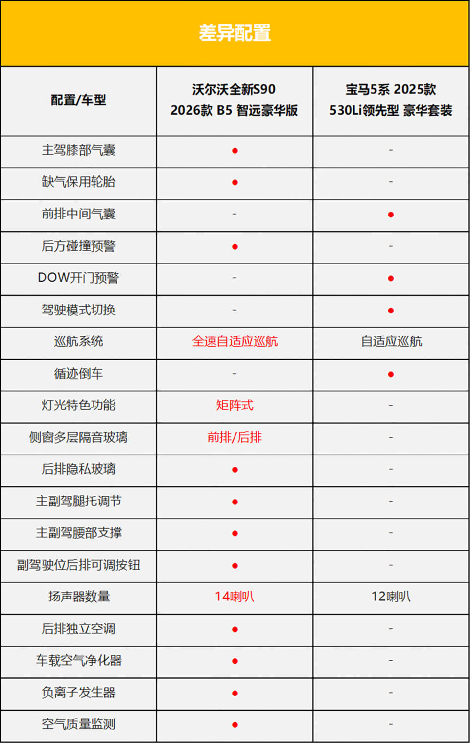 為了更有參考性,我們拿比較走量的車款進行對比,分別是沃爾沃全新S90 2026款 B5 智遠豪華版和寶馬5系 2025款 530Li領先型 豪華套裝。