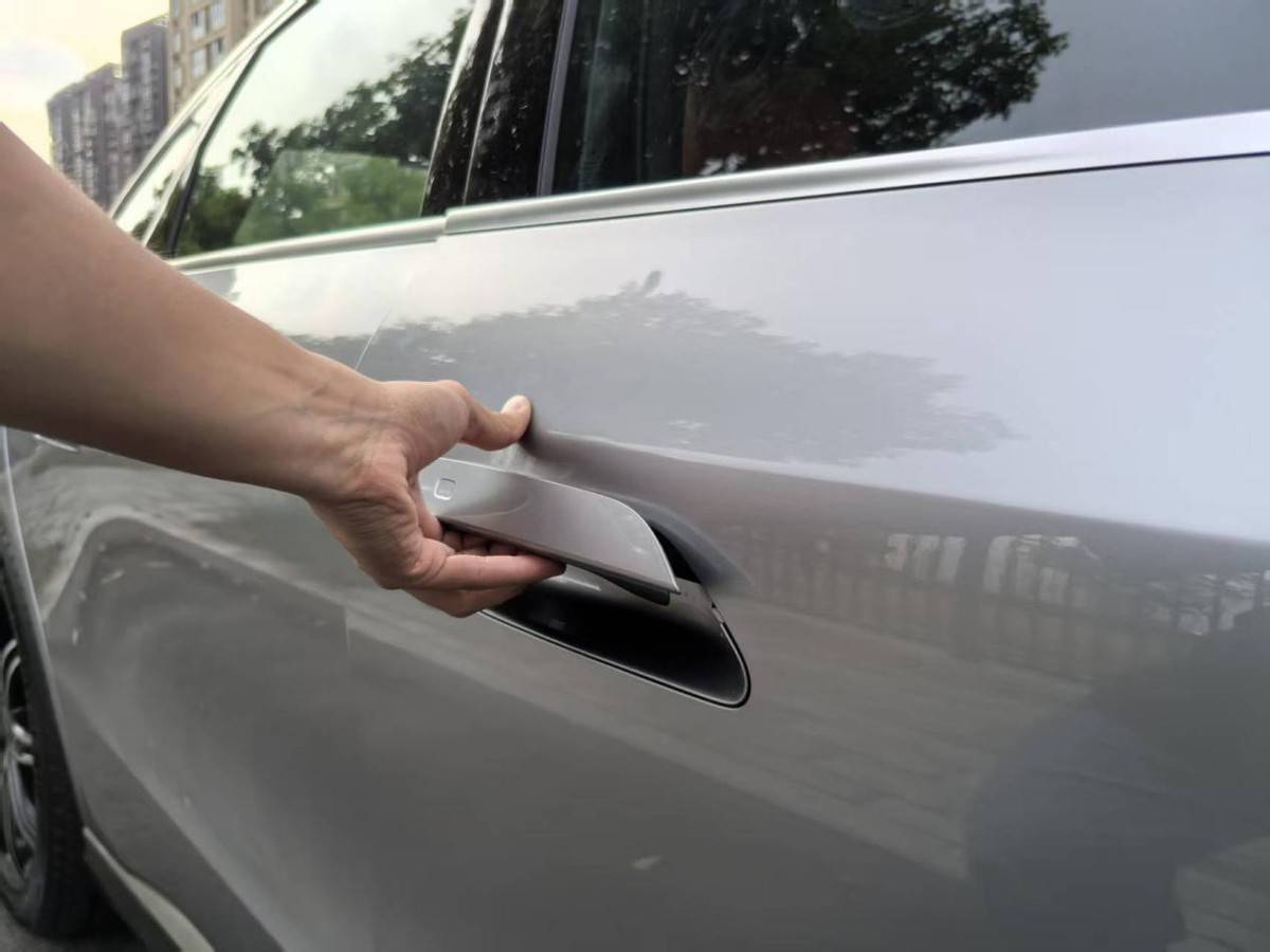外觀大家都熟悉了,不再細說,幾個細節還是很不錯的,首先就是車外的半隱藏式門把手,采用機械的開啟方式,并且頂配車型還能支持電動開啟,手伸進去,車門就自動彈開了,和問界M8的門把手很相似,既能降低風阻還能保持美觀,感覺這種樣式的門把手在新能源車型里已經近乎是最優解了。