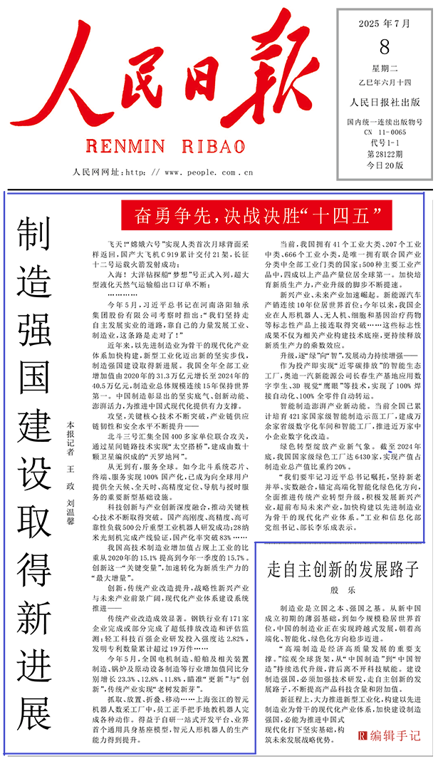 7月8日,《人民日報》于頭版頭條發表題為《制造強國建設取得新進展》的文章,點贊奧迪一汽新能源公司長春生產基地,“作為投產即實現‘近零碳排放’的智能生態工廠,奧迪一汽新能源公司長春生產基地應用數字孿生、3D視覺‘鷹眼’等技術,實現了100%焊接自動化、100%全零件自動轉運”, 以逐“綠”向“智”,助推發展動力持續增強。