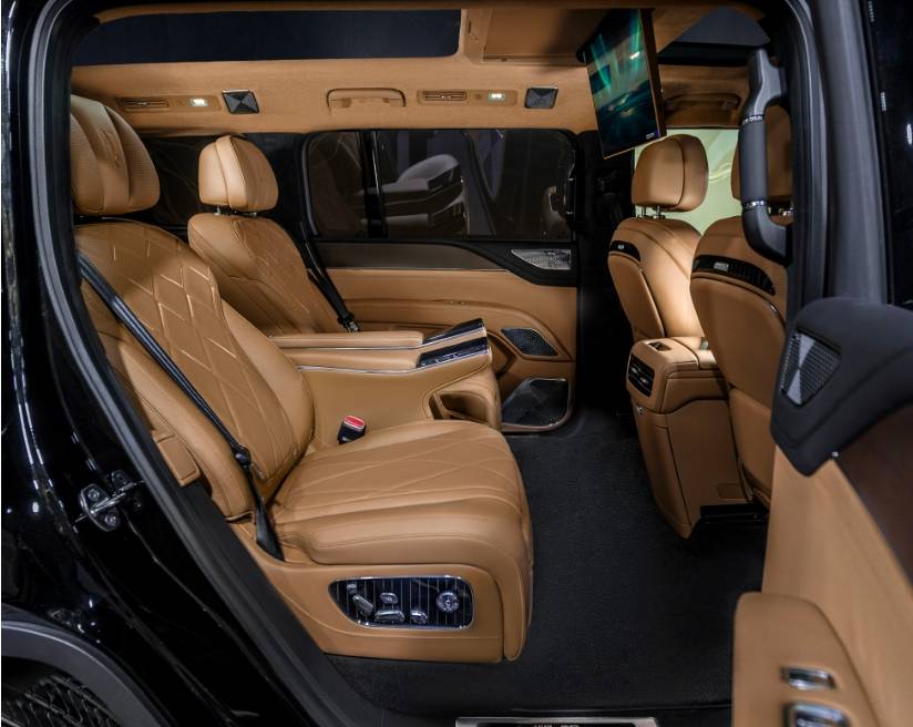 從曝光的圖片來看,仰望U8L鼎世版第二排配備2張獨立座椅,采用棕色皮質面料包覆,帶有菱形座椅紋路,配備電動腿托、內側扶手屏等配置,且第二排座椅具有一鍵零重力模式,預計還會提供加熱、通風、按摩等功能。