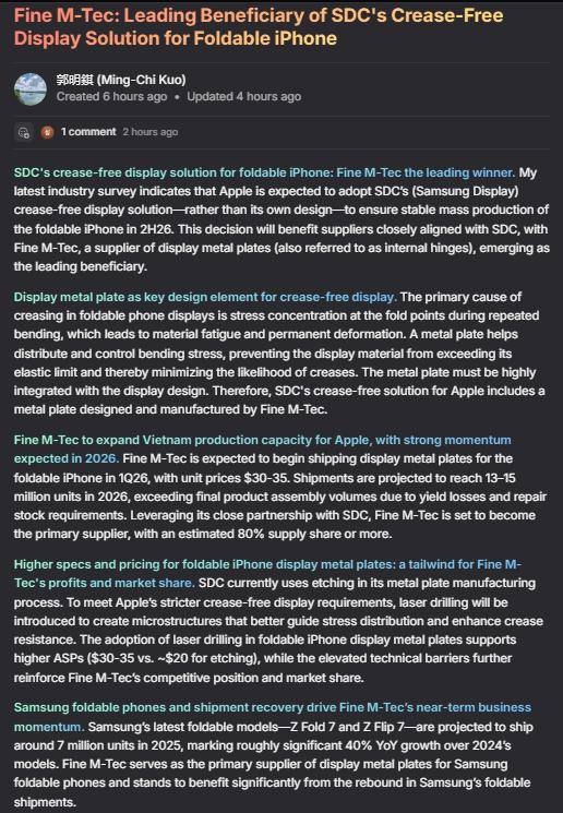 郭明錤還表示,Fine M-Tec 預計將于2026年第一季度開始出貨折疊iPhone用顯示器金屬板。該金屬板的單價約為30-35美元,2026年的出貨量預計達到1300萬至1500萬個。