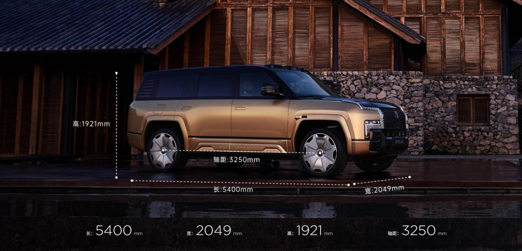 側(cè)面來看,側(cè)面造型較為方正、平直,略微向外凸出的輪拱肌肉感十足。另外,仰望U8還采用了隱藏式車門把手設(shè)計(jì)進(jìn)一步提升其時(shí)尚感。并且,新車還提供22英寸、23英寸輪轂可選,大餅式的輪轂造型,豪華感十足。車尾部分,兩側(cè)造型銳利的尾燈組點(diǎn)亮后極具辨識(shí)度。尺寸方面,仰望U8L長寬高分別為5400/2049/1921mm,軸距為3250mm,相比仰望U8豪華版軸距增加200mm,定位全尺寸行政豪華SUV。