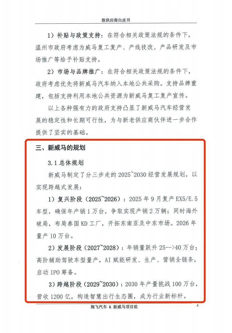 為了推動新威馬復活,翔飛公司表示,地方政府將直接支持新威馬。上述文件顯示,溫州市政府及溫州海洋經濟發展示范區已成立專項工作組,協助重整后的復工復產工作,包括協調浙江及溫州本地供應商,促進合作并解決歷史問題。