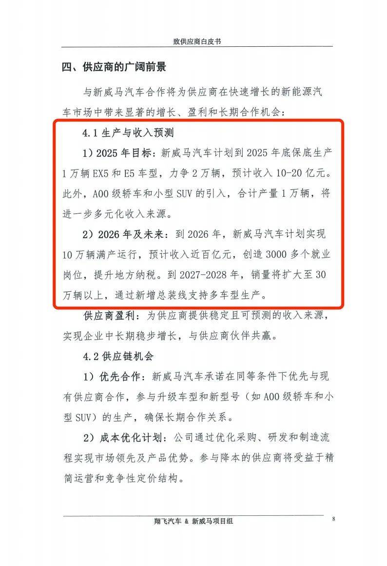 作為投資人,翔飛公司在上述文件中表示,根據2025年4月3日法院裁定批準的重整計劃,翔飛已接管威馬四公司,正在全力以赴推動威馬EX5和E5車型在溫州基地快速恢復量產。目前,上海、溫州等政府也對該項目提供了強有力支持,與煥然一新的“新威馬汽車”合作有光明前景。