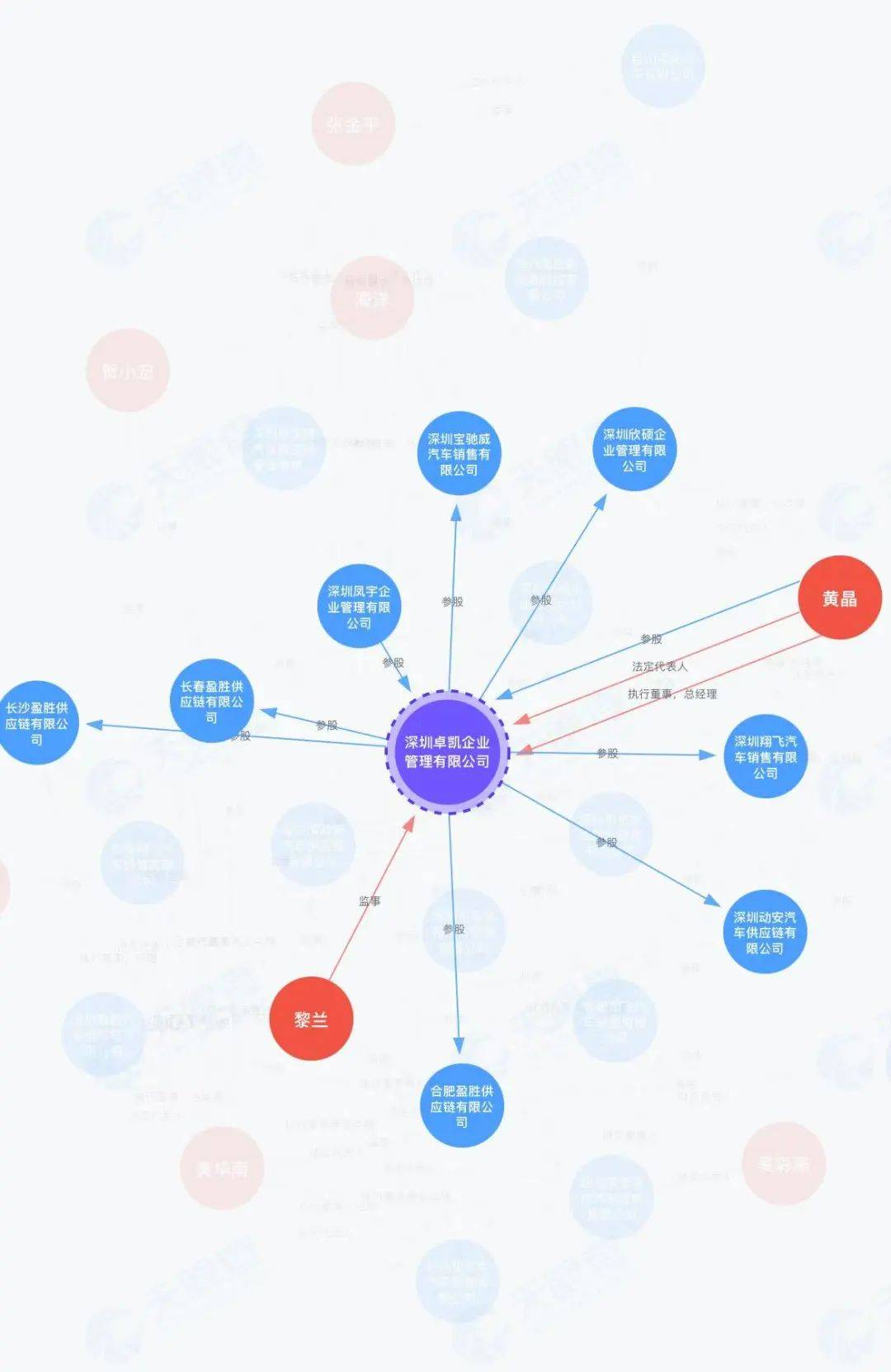 經調查發現,深圳翔飛法人不僅是寶能汽車子公司實控人,其關聯方還持有寶能系企業股權。天眼查信息顯示,深圳翔飛的主要股東為深圳卓凱企業管理有限公司(以下簡稱“深圳卓凱”)和深圳鳳宇企業管理有限公司(以下簡稱“深圳鳳宇”)。深圳卓凱的法定代表人和實控人為黃晶,而在黃晶的關聯企業中,則出現了昆山寶能汽車有限公司等企業的身影。