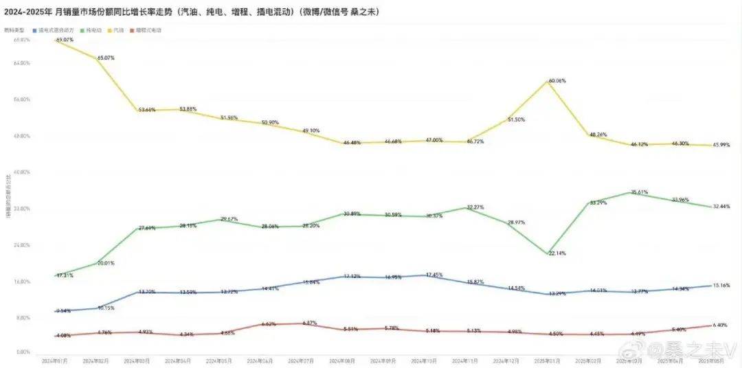 在他看來,根據(jù)中國近幾年的發(fā)展情況看,其實(shí)可以明顯感受到近三四年一直處于內(nèi)部品牌重構(gòu)階段,從2024年到今年5月各燃料車型的銷量份額和銷量走勢分析,也正傳遞出“結(jié)構(gòu)穩(wěn)定”的信號。