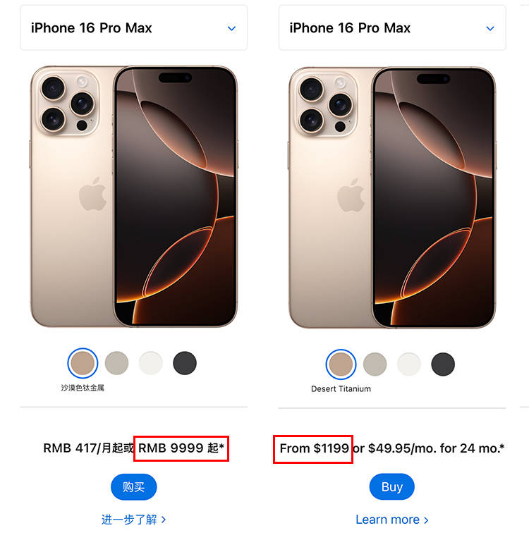 根據蘋果官網顯示,目前最貴的iPhone是iPhone 16 Pro Max,美國官網定價1199美元起,在中國官網對應的定價是人民幣9999元起,“匯率”大概是1:8.34,也是目前所有iPhone“匯率”最高的款式。