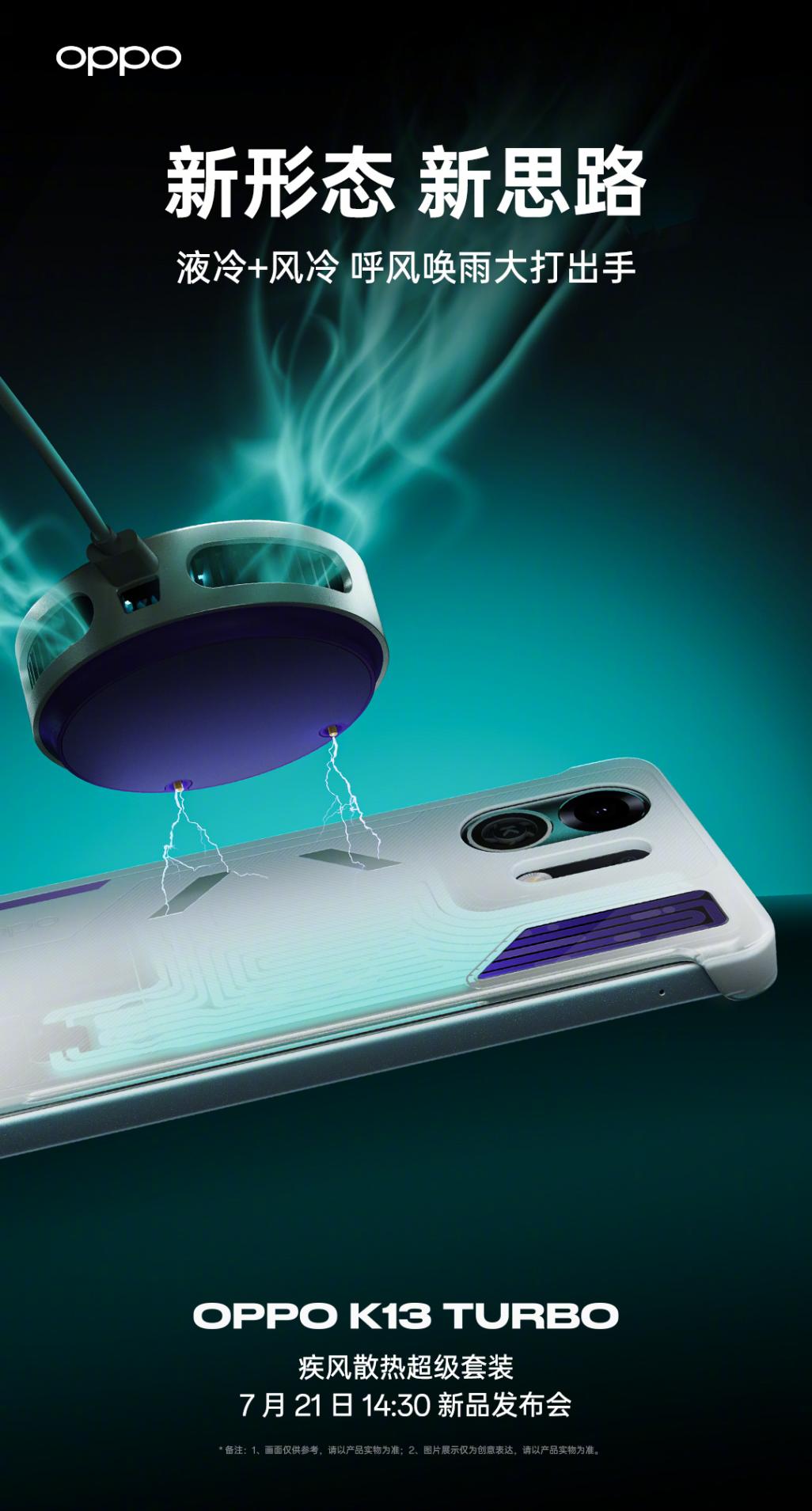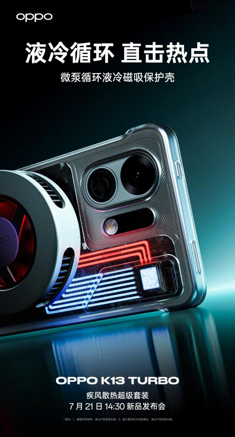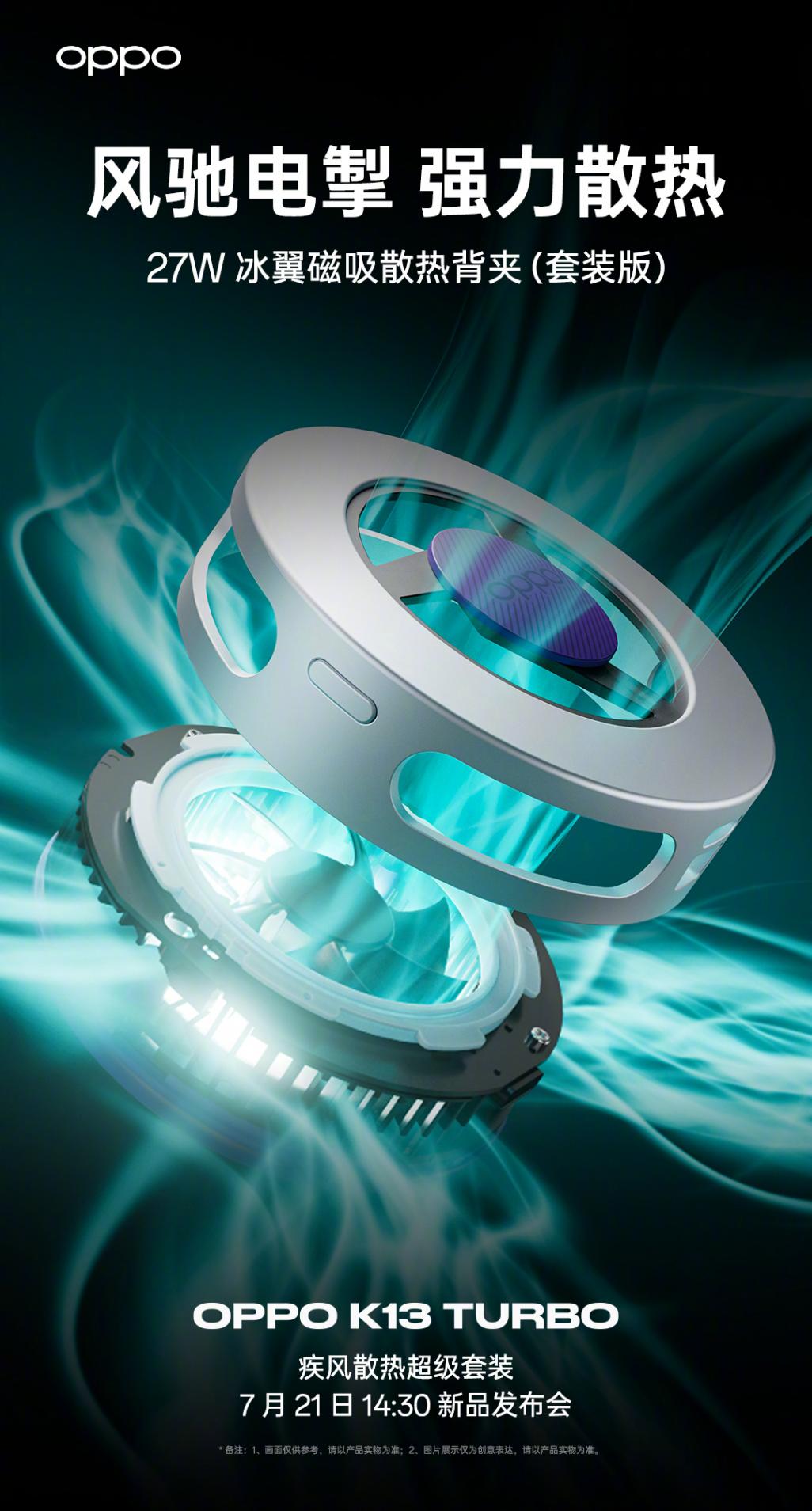 7 月 15 日消息,OPPO K13 Turbo 疾風散熱超級套裝新品今日亮相,微泵循環(huán)液冷磁吸保護殼 + 27W 冰翼風冷磁吸散熱背夾,7 月 21 日發(fā)布。