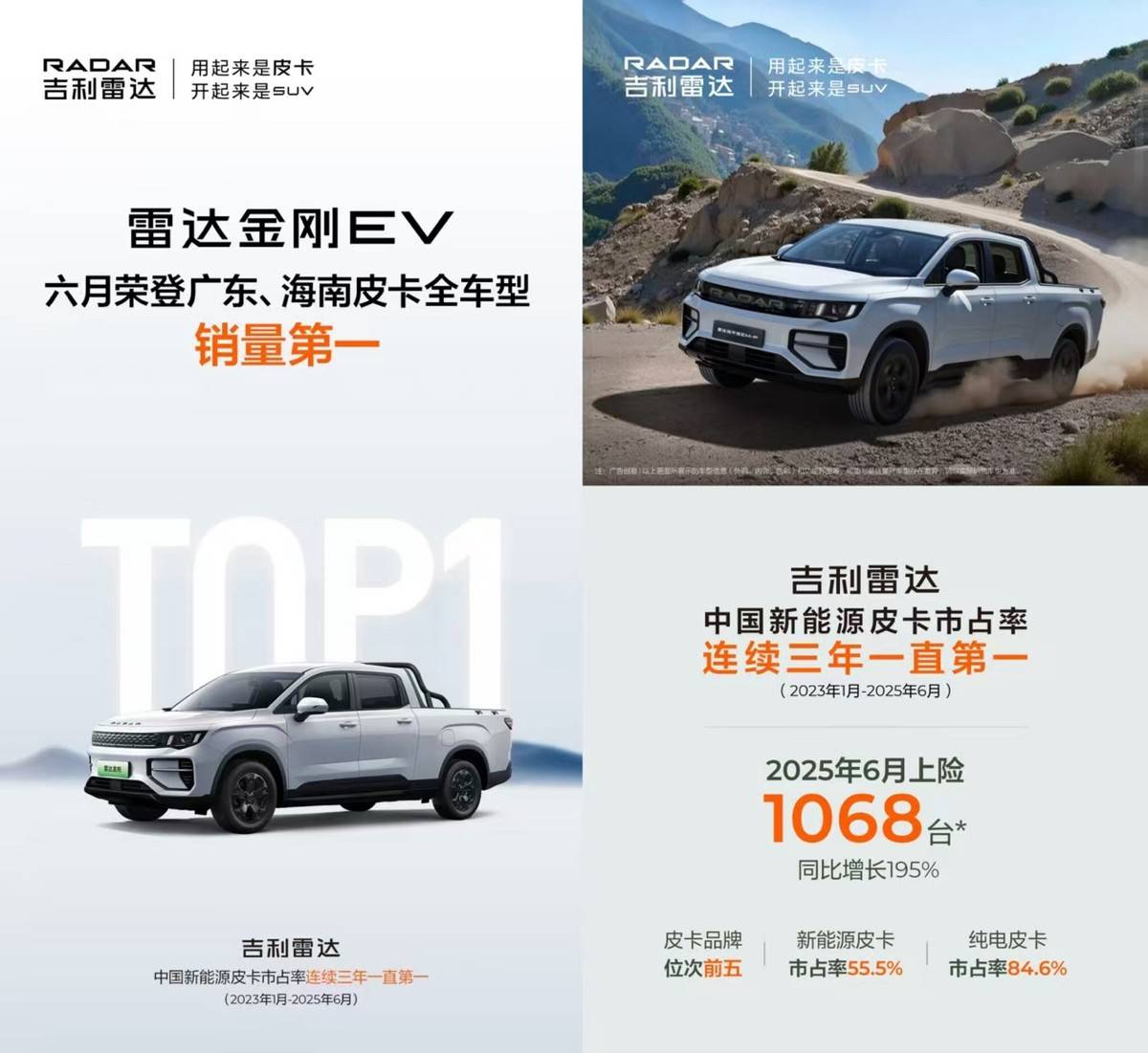 2025年6月,皮卡市場迎來歷史性轉折點:吉利雷達金剛純電車型在廣東、海南等關鍵省份,單月銷量強勢超越傳統燃油領域的霸主長城商用炮,登頂單省單車型銷量榜首。與此同時,吉利雷達金剛純電在浙江、江蘇等省份的銷量也位列前三甲,超越商用炮的城市更是多達46個。同期,吉利雷達全系皮卡上險量達1068輛,同比激增195%;新能源皮卡市占率55.5%,純電皮卡市占率更以84.6%的壓倒性優勢穩居第一。