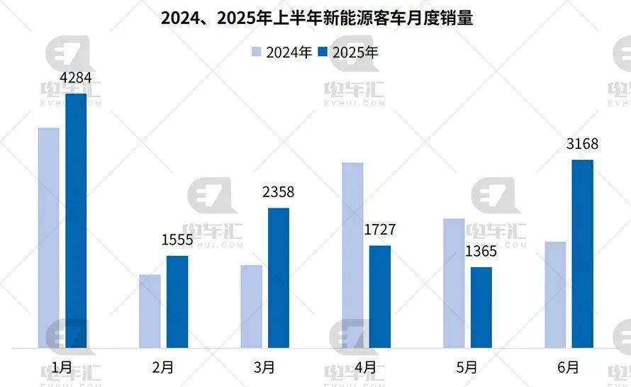 2024、2025年上半年新能源客車月度銷量