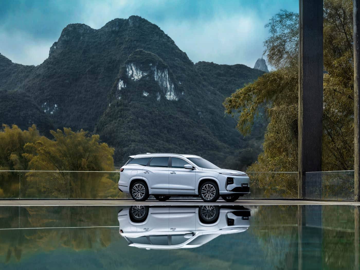 全新山海 L9 則展現(xiàn)出硬朗風格。前臉大面積中網(wǎng)格柵與獨特的分體式頭燈相連,上方還有貫穿式燈帶,夜晚點亮效果醒目。車身側(cè)面線條方正平直,力量感十足,車門下的鍍鉻裝飾與前臉呼應(yīng),提升了整車顏值。車長 4862mm、車寬 1925mm、車高 1784mm、軸距 2850mm,雖在尺寸上略小于理想 L8,但也具備相當?shù)臍鈭觥\囄驳呢灤┦轿矡粼O(shè)計,使其在外觀顏值上不輸給競品。