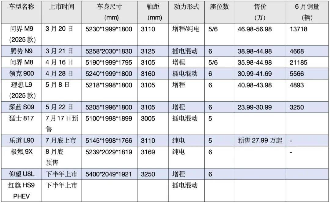 長鏡頭注意到,這已經是今年以來,各車企全新發布(包括已經上市和即將上市的)的第7款車長超過5.1米,軸距超過3米的新能源SUV,再算上出了年型款的既有車型,中國車市突然進入大型SUV時代。我們不妨先列舉一下(按發布時間先后順序)。