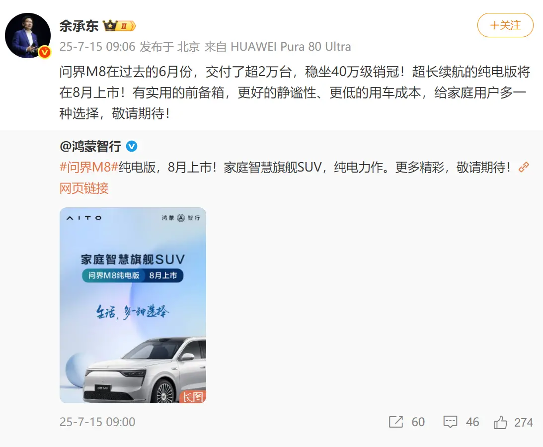 問界M8純電版將8月上市,首批搭載HUAWEI ADS 4