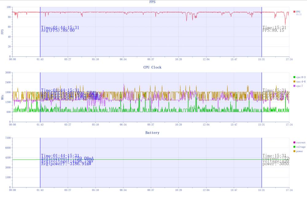 首先在日常游戲中,王者榮耀開啟90幀模式的高畫質,平均幀率88.92fps,最低幀63.53fps,抖動率1.19,最大溫度39℃。整體還算比較流暢,能玩的程度。