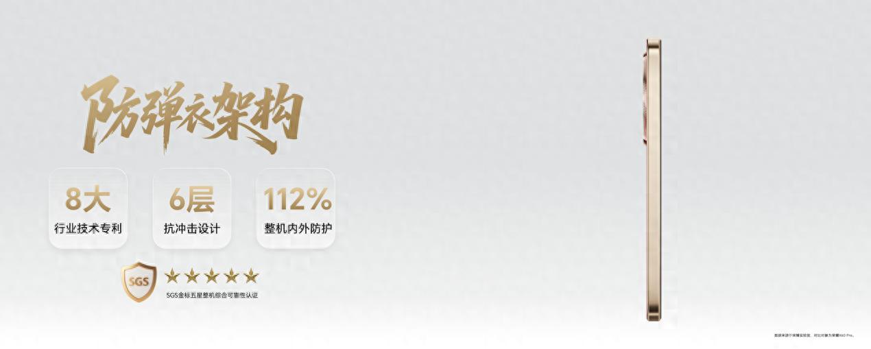 榮耀X70行業首個通過SGS金標五星整機綜合可靠性認證,防摔不挑高度、角度、路面,最高支持2.5米全角度抗跌落,遠超行業主流1.5米抗摔標準;同時,榮耀X70還可以輕松應對水泥地、盲道石等數十種復雜路面,支持邊框、背面、屏幕全角度跌落防護。發布會展示中,榮耀X70更完成193噸大型設備碾壓、子彈射擊等多重極限挑戰。