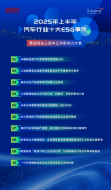 作為專業(yè)的汽車研究與傳播機(jī)構(gòu),華汽研究院2025年1月曾邀請(qǐng)眾多行業(yè)和ESG專家學(xué)者共同評(píng)選并發(fā)布“2024年中國(guó)汽車十大ESG事件”,引起行業(yè)的廣泛關(guān)注。在2025年賽程過半之時(shí),我們又對(duì)今年以來(lái)中國(guó)汽車行業(yè)發(fā)生的與ESG相關(guān)的事件進(jìn)行了梳理,并總結(jié)出2025年上半年十大ESG事件。我們希望汽車企業(yè)進(jìn)一步提升ESG意識(shí),加強(qiáng)ESG管理,不斷提升可持續(xù)發(fā)展水平,促進(jìn)全行業(yè)健康良性發(fā)展。