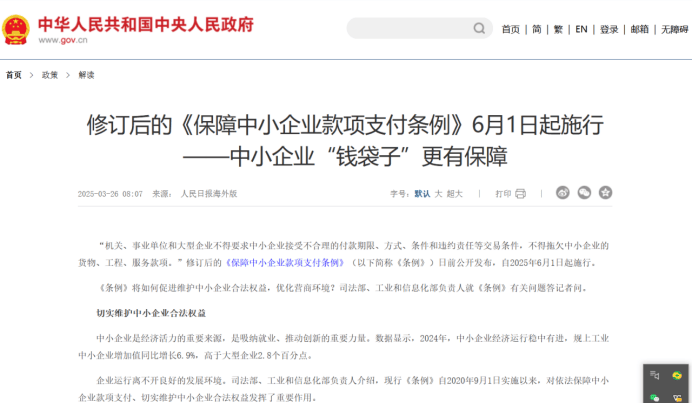 事實(shí):國(guó)務(wù)院頒布修訂的《保障中小企業(yè)款項(xiàng)支付條例》于6月1日正式落地實(shí)施。新規(guī)明確要求,大型企業(yè)在與中小企業(yè)開展采購(gòu)業(yè)務(wù)時(shí),賬期不得超過60天。