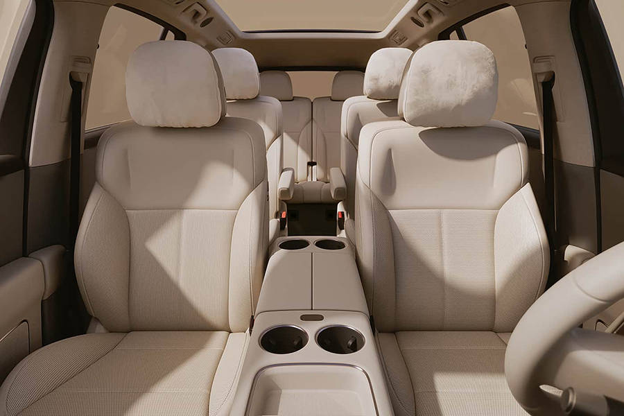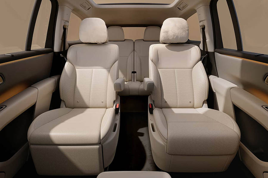 從第二排座椅圖片來看,其采用2+2+2的座椅布局,并配備車內氛圍燈、全景天幕以及疑似二排隱私簾,同時,其門板處設有尺寸較大的儲物槽,滿足二三排乘客的儲物需求。