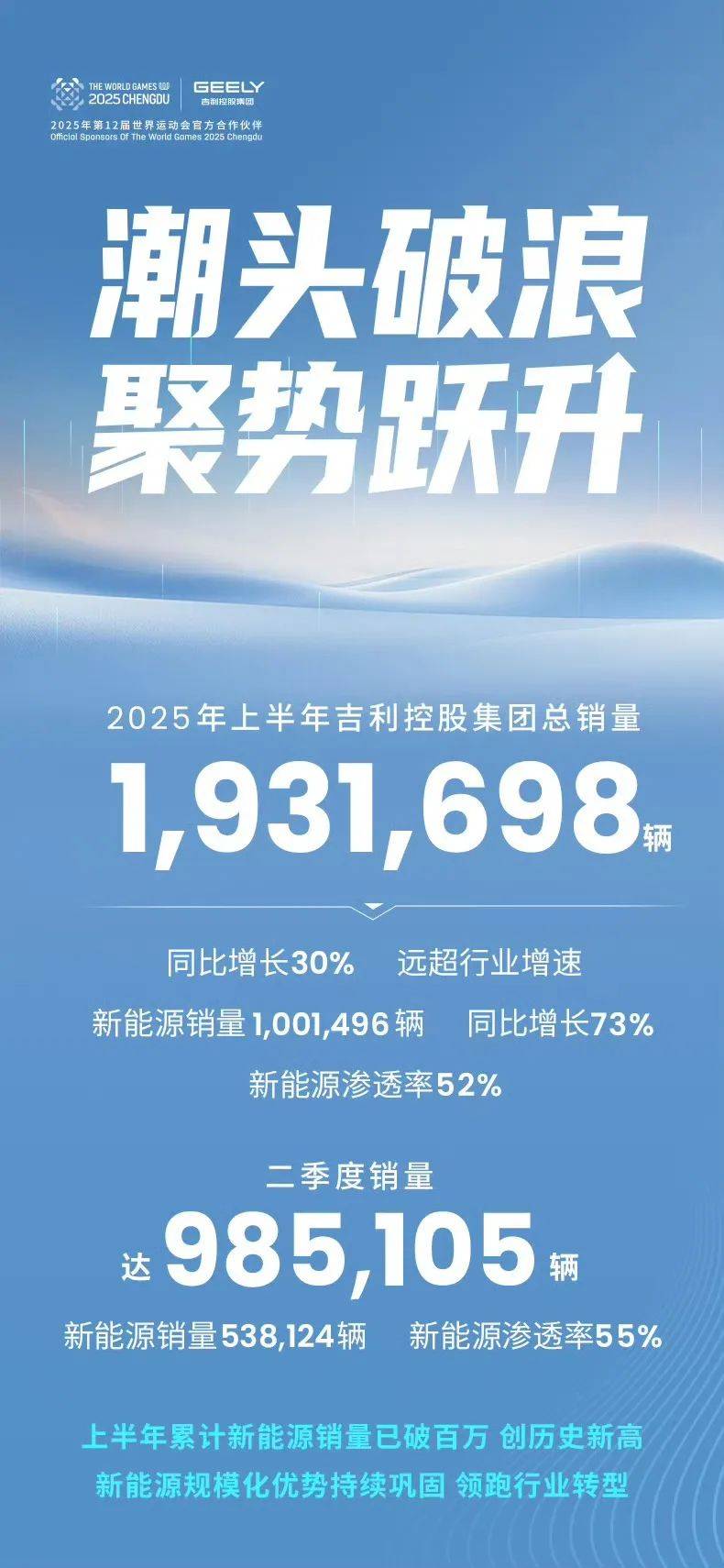 值得注意的是,吉利控股集團(tuán)整車銷量已連續(xù)三個(gè)季度穩(wěn)超90萬(wàn)輛;上半年累計(jì)新能源銷量已破百萬(wàn),創(chuàng)歷史新高。這一系列數(shù)據(jù)的背后,是吉利從戰(zhàn)略到執(zhí)行、從技術(shù)到市場(chǎng)的全面協(xié)同,進(jìn)一步印證了其以體系協(xié)同和結(jié)構(gòu)韌性為核心的長(zhǎng)期主義路線的正確性和有效性。