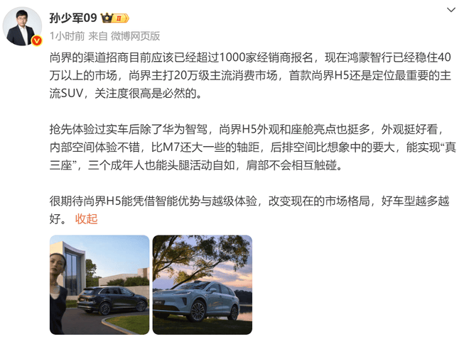 除此之外,尚界的渠道招商目前已有超過1000家經銷商報名,主打20萬級主流消費市場。