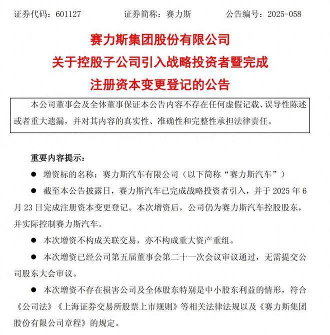 公告稱,本次增資有利于增強賽力斯汽車資本實力,助力戰略縱深布局,降低資產負債率,促進其可持續高質量發展,符合公司的發展戰略規劃和長遠利益,符合公司全體股東利益。