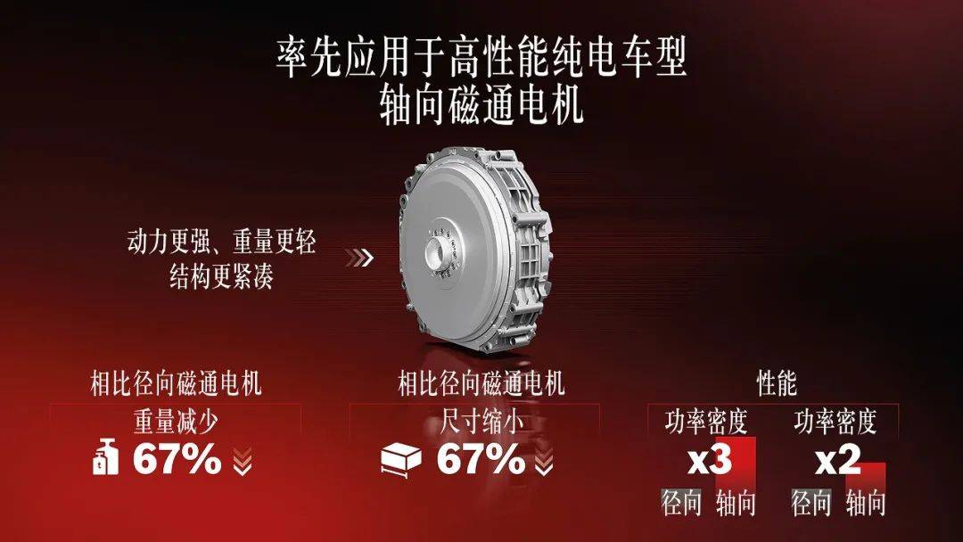 創(chuàng)新軸向磁通電機(jī)相比于當(dāng)前絕大多數(shù)電動(dòng)車型的徑向磁通電機(jī),僅需其1/3的重量和體積,便可輸出同等功率。不僅有助于減重,更以緊湊的電驅(qū)系統(tǒng)尺寸,實(shí)現(xiàn)多部電機(jī)的靈活布局,為車內(nèi)提供更多空間。