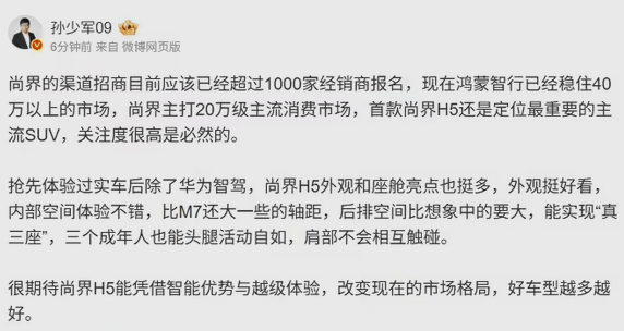 7 月 14 日消息,據(jù)媒體報(bào)道,華為旗下尚界汽車動(dòng)作頻頻,目標(biāo)直指 20 萬(wàn)級(jí)主流消費(fèi)市場(chǎng)。其首款車型 H5 定位主流 SUV,主打性價(jià)比和實(shí)用性,目前已吸引超 1000 家經(jīng)銷商報(bào)名參與渠道招商。