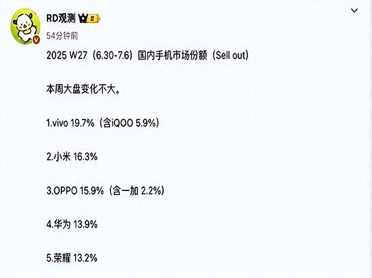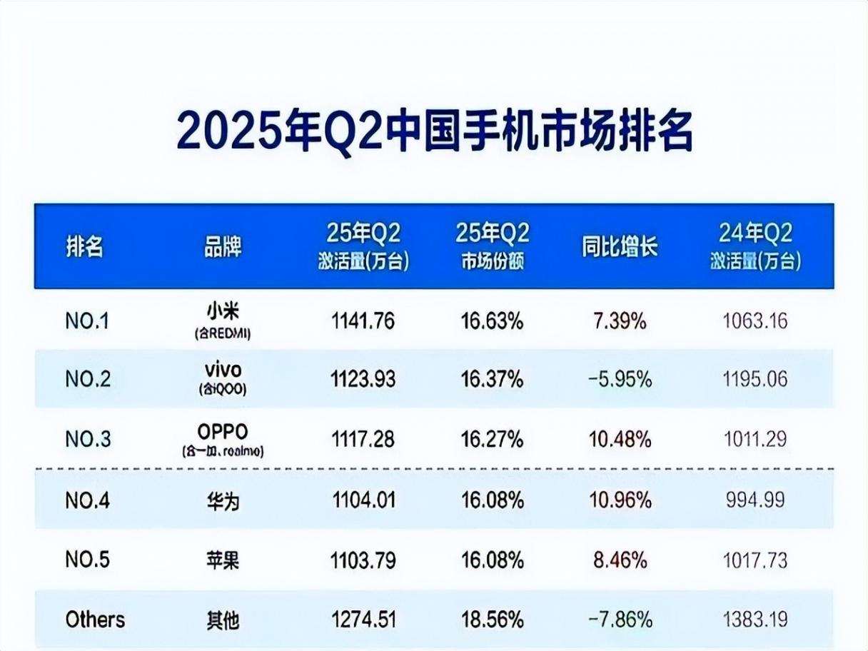 2025年二季度中國手機市場洗牌:華為靠自研芯片和衛星通信以28.3%市占率登頂,蘋果祭出12%降價大招環比暴漲67%重返前三,小米卻因庫存壓力跌出前五。