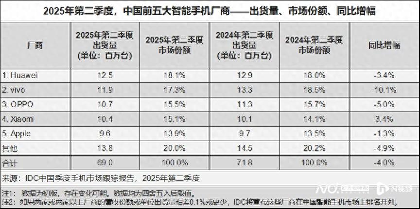 在中國市場,IDC數(shù)據(jù)顯示,2025年第二季度中國智能手機(jī)市場出貨量結(jié)束了連續(xù)六個(gè)季度同比增長,出貨量只有6896萬部,同比下降4.0%。值得注意的是,華為今年第二季度在中國智能手機(jī)市場的份額達(dá)到約18%,重回榜首,而vivo和OPPO等品牌的市場份額下滑。