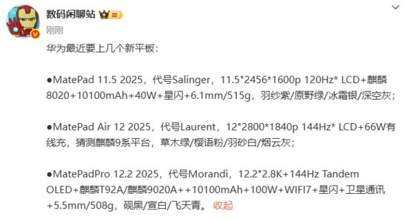 此外,華為MatePad Air 12 2025代號為“Laurent”。它采用12英寸LCD屏幕,支持2800×1840分辨率和144Hz刷新率。該博主猜測將搭載麒麟9系平臺。另外,該平板支持66W有線快充,擁有草木綠、櫻語粉、羽砂白和煙云灰四種配色。