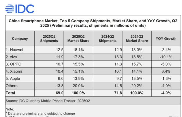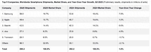 蘋果占 15.7%,雖在新興市場有兩位數增長,但中國市場二季度下跌 1%;小米受印度市場影響,二季度僅增長 0.6%;vivo 和傳音分列四五名,傳音一季度受挫,二季度雖重回前五,但出貨量同比下滑近 2%。