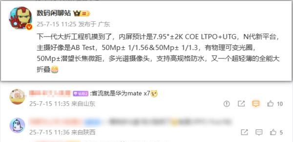 7月15號網(wǎng)上有數(shù)碼博主說華為要出新款折疊手機(jī)Mate X7,主打拍照功能升級,主攝像頭能自己變光圈大小,還有多光譜鏡頭,屏幕防水也做了加強(qiáng)。這消息是CNMO科技報(bào)道的,具體參數(shù)開始陸續(xù)被挖出來了。
