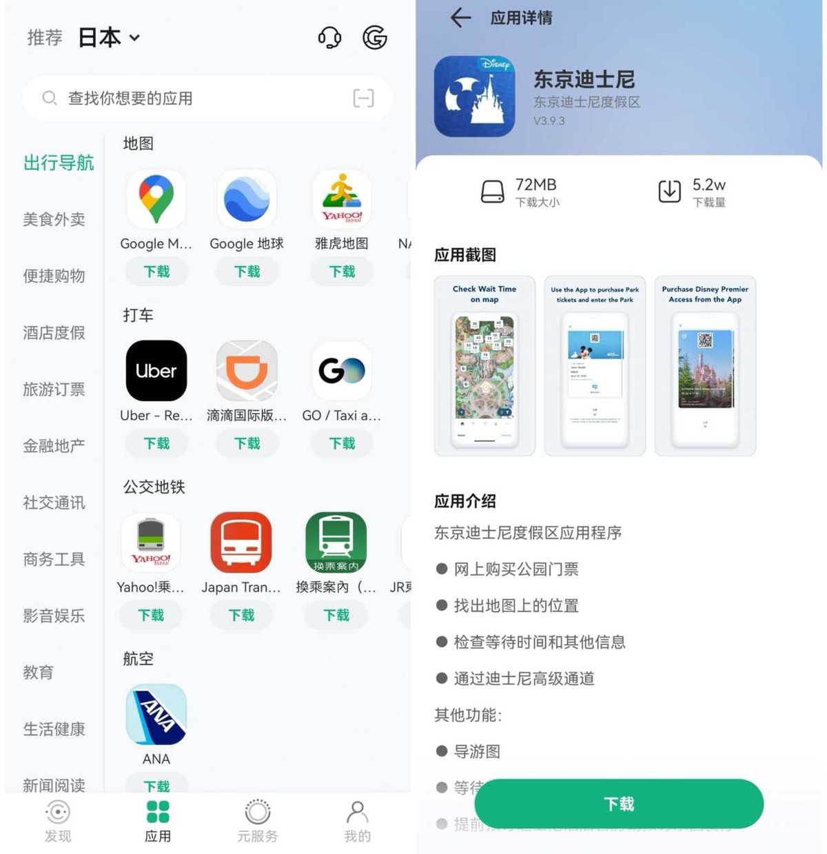 出境易App就像一個“境外生活百寶箱”,會根據你的目的地自動推薦當地常用App。比如去日本游玩時,你可以通過出境易App,下載到實時查看演出時間表的東京迪士尼樂園App,再也不會錯過自己喜歡的巡游演出;還有查地鐵運營狀況的Yahoo!乘換案內,輕松找到合適的換乘路線;以及可以預定餐廳的Tabelog,不錯過心儀的異域美食。