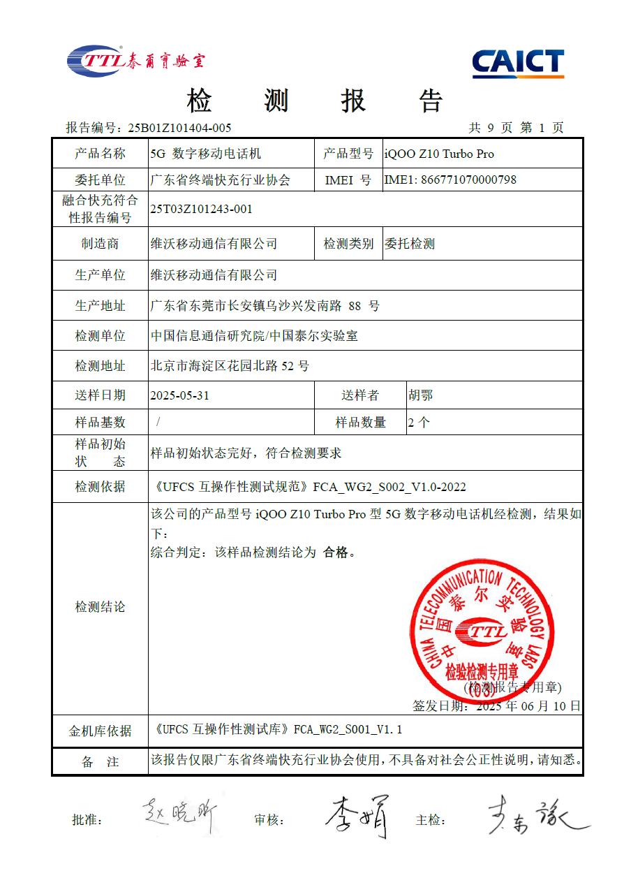 7 月 16 日消息,據(jù) FCA 終端快充行業(yè)協(xié)會今日消息,vivo 旗下 iQOO Z10 Turbo Pro 手機成功通過了融合快速充電功能認證,獲得了 UFCS 功能認證證書,證書編號是
