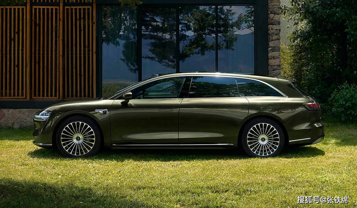 車身側面部分的造型很舒展流暢,B柱之前的部分和享界S9基本一致,作為一輛旅行車,向后延伸的車頂形成了更大的后備箱結構,后側窗使用了更大面積的玻璃,車窗鍍鉻飾條風格和享界S9一致,為半框式,而車門還是無窗框式的結構。車門把手為伸縮式,車身底部帶有鍍鉻裝飾。