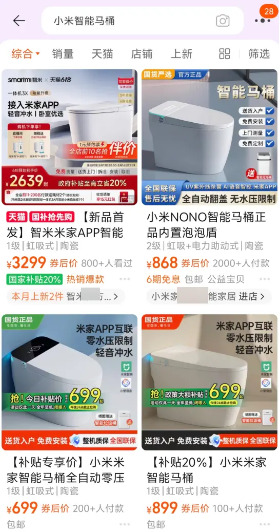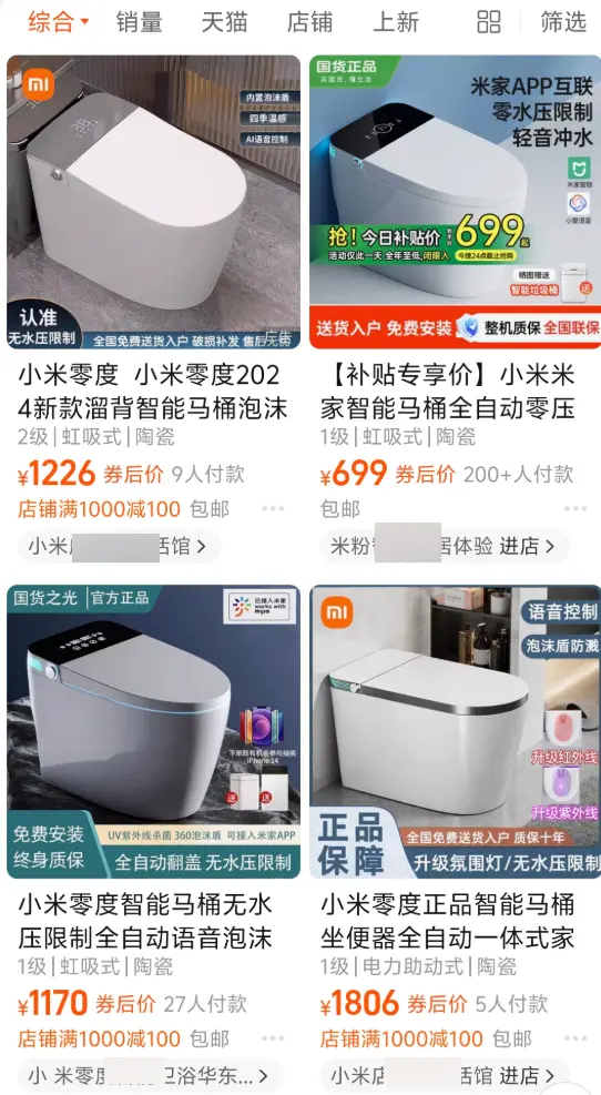 然后我就自己跑去網購平臺,指名道姓搜索“小米智能馬桶”出來的結果。