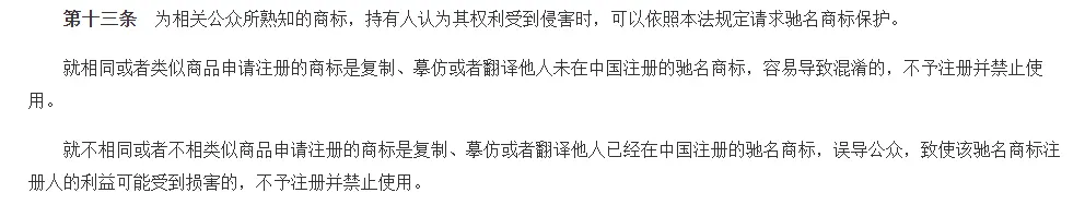 “就相同或者類似商品申請注冊的商標是復制、摹仿或者翻譯他人未在中國注冊的馳名商標,容易導致混淆的,不予注冊并禁止使用。就不相同或者不相類似商品申請注冊的商標是復制、摹仿或者翻澤他人已經在中國注冊的馳名商標,誤導公眾,致使該馳名商標注冊人的利益可能受到損害的,不予注冊并禁止使用。”