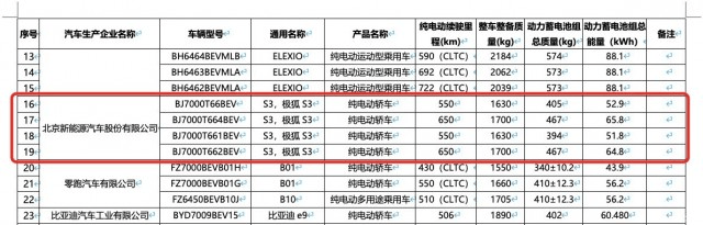 日前,近日,工信部發布的《第十九批減免車輛購置稅的新能源汽車車型目錄》中,北汽極狐S3的續航信息正式曝光。