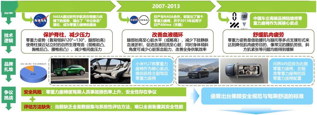 智駕背景下,汽車座艙融入了休息、辦公和娛樂等第三生活空間的場景,源自NASA在上世紀八十年代的零重力座椅概念已成為高端品牌競相布局的核心賣點,如小米YU7的雙零重力座椅和問界M9的右后零重力座椅,然而零重力座椅存在較大碰撞損傷風險,零重力座椅如何兼顧舒適和安全,成為產業亟待解決的關鍵課題。