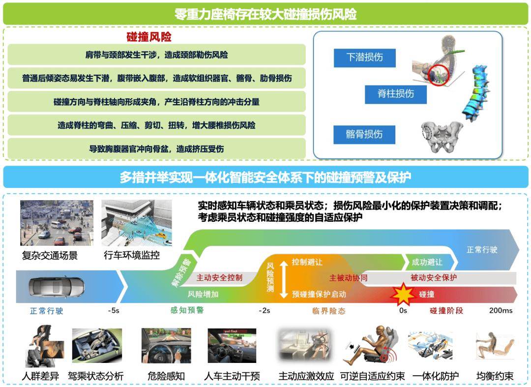 “零重力座椅當前存在較大的碰撞損傷風險,事故發生時頸部、腹部、脊柱損傷的風險較大,亟需開展安全評測和保護技術研究。一體化智能安全體系能夠實時感知車輛狀態和乘員狀態,并快速實施損傷風險最小化的保護裝置決策和調配,考慮乘員狀態和碰撞強度的自適應保護,實現在復雜交通場景下對駕乘人員的保護。”