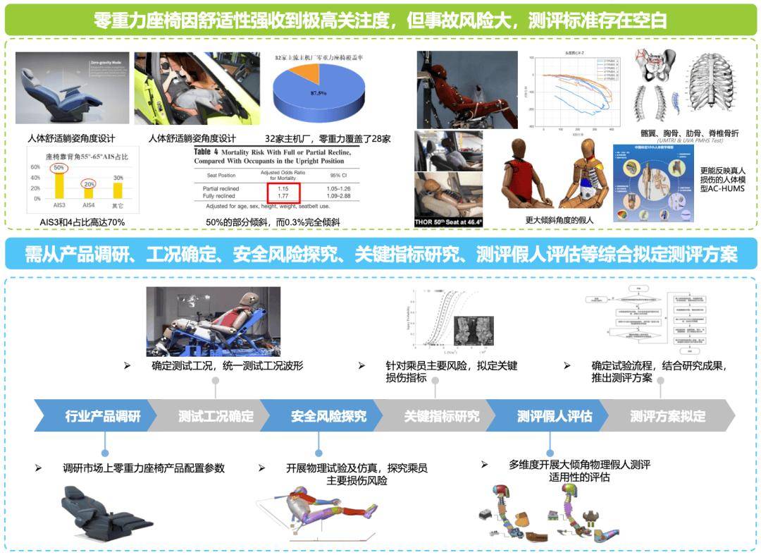 中國汽車工程研究院股份有限公司汽車安全技術中心檢測工程事業部青年專家費敬提出:“零重力座椅舒適性強、體驗感好,已成為主流車企高端品牌的重點布局方向,然而零重力座椅帶來了新的運動學響應和損傷模式,目前國內外大傾角座椅的事故傷亡率較高,安全性亟待加強,需要從產品調研、工況確定、安全風險探究、關鍵指標研究、測評假人評估綜合擬定測評方案,助力零重力座椅安全性提升。”