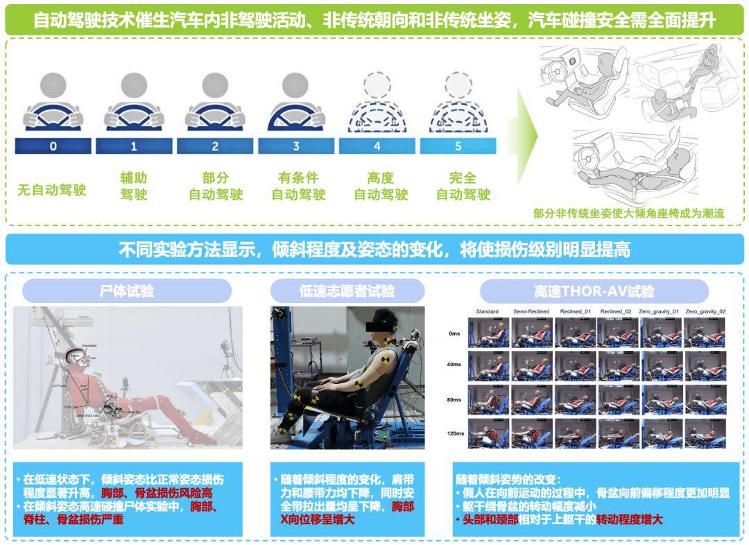 湖南大學車輛安全研究中心主任、教授白中浩認為,自動駕駛使未來汽車乘員活動空間更為自由,催生出許多非駕駛活動、非傳統朝向與坐姿,而大傾角座椅能夠提高舒適度、減少疲勞,已成為重要發展趨勢;尸體試驗、低速志愿者試驗和高速THOR-AV試驗均已表明,隨傾斜姿態和程度的改變,胸部、骨盆的損傷風險將會加劇,在高速駕駛下,脊柱、頭部和頸部也將發生嚴重損傷。