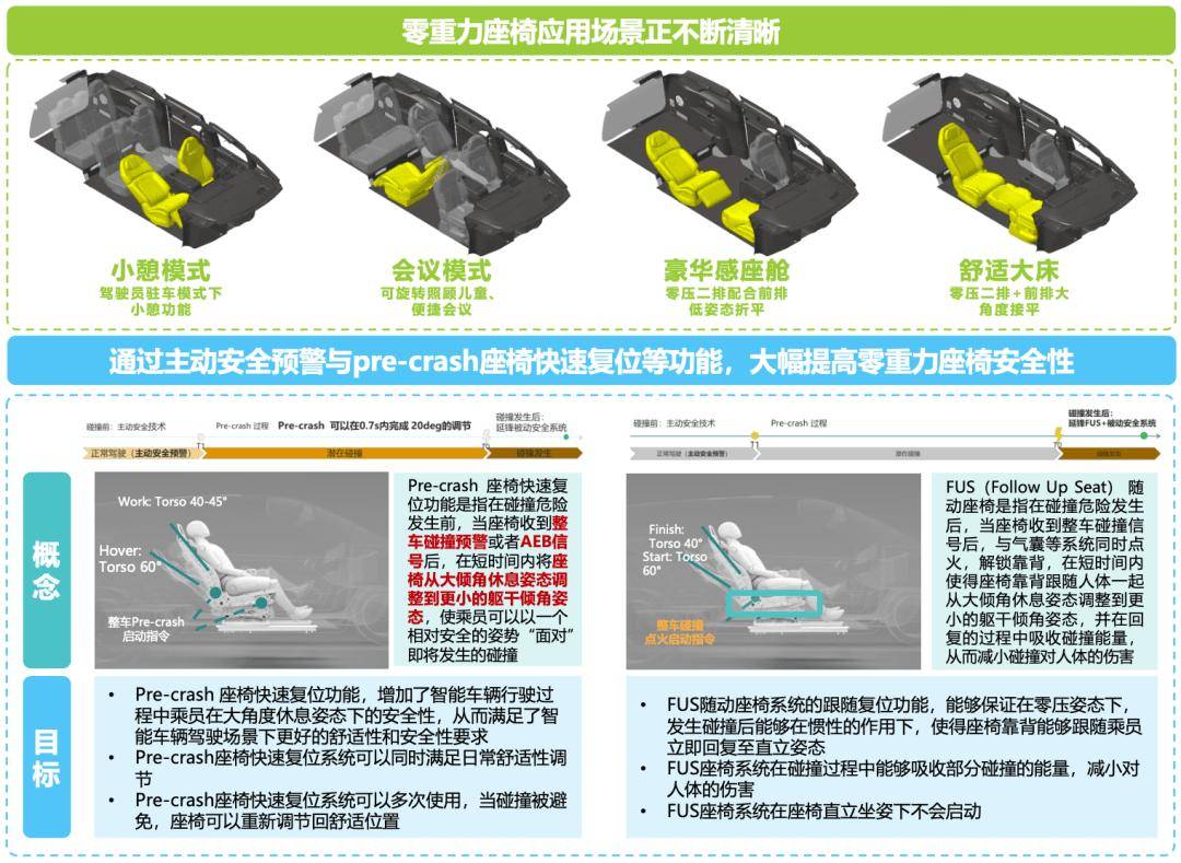 延鋒汽車智能安全技術中心系統開發總監吳水波表示:“經過3年的舒適性研究,調研走訪不同群體上千人,零重力座椅應用場景已不斷明確,參考現有標準、法規對直立坐姿下如何定義傷害的標準和邏輯,以及基于真實世界中碰撞傷害的統計研究,延鋒科技通過碰撞前的主動安全預警、pre-crash座椅快速復位、靠背回位系統(FUS)等技術大幅提高了零重力座椅的安全性。”