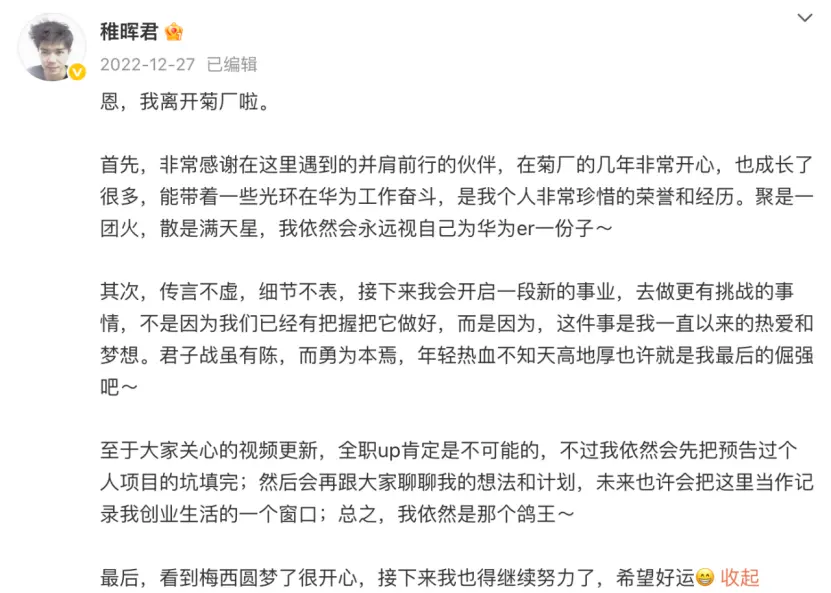 在華為工作兩年的稚輝君,于2022年12月離職,他說自己接下來要做的事情,是一直以來的熱愛和夢想。