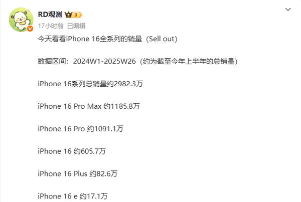 近日,有數(shù)碼博主曝光了iPhone 16系列截止2025年第26周在中國(guó)大陸市場(chǎng)的最新銷量數(shù)據(jù):