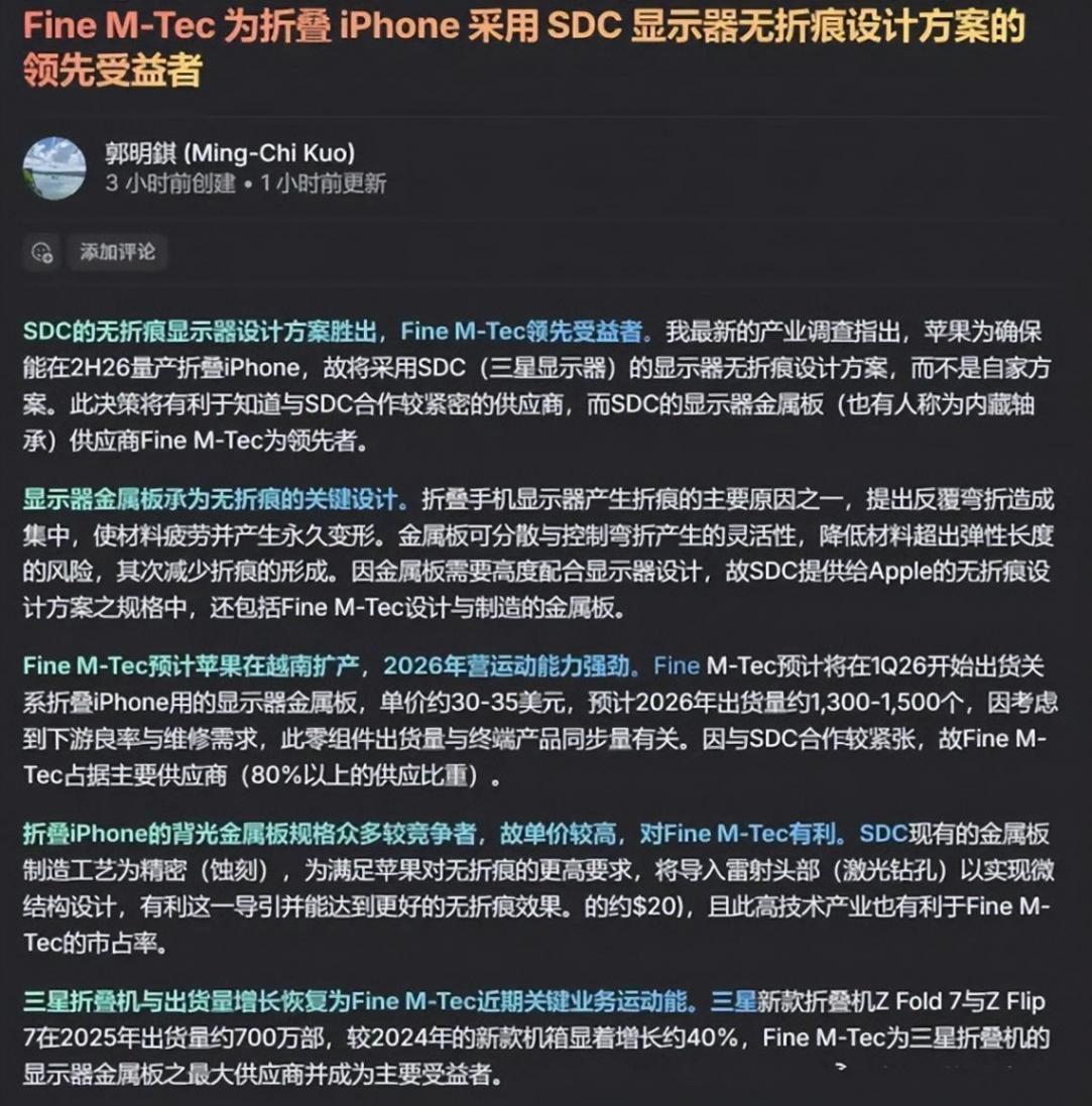 近日,分析師郭明錤透露,為了確保折疊iPhone如期量產,蘋果放棄了自研方案,并改用三星的無折痕方案。畢竟蘋果自研折疊鉸鏈多年卻遲遲未有突破。