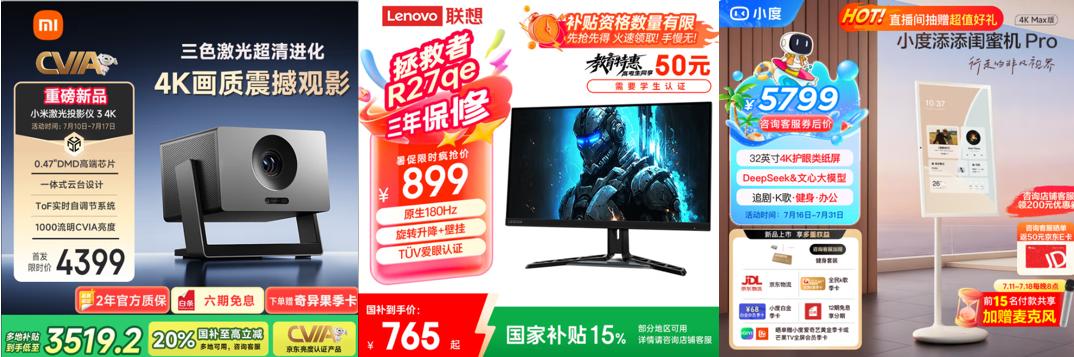 場外觀賽想要身臨其境的體驗,視聽上的沉浸感不可或缺。不論是獨自觀賽,還是選擇與朋友“眾樂樂”,硬核設備必不可少。京東3C帶來小米激光投影儀3、聯想拯救者27英寸2K超清電競顯示器等爆款單品,能將蘇超賽場上的每一個細節都清晰呈現,為場外觀眾打造一個專屬的“賽場”,在場外也能直接感受到現場般的熱烈氛圍,用戶選購還可享有國家補貼等超多福利。此外,為滿足居家觀賽的閑適狀態,上京東入手小度添添閨蜜機Pro4KMax版,32英寸的屏幕,既能高質量觀賽,又能輕便移動,搭配長續航能力,隨時隨地開啟激情觀賽模式。